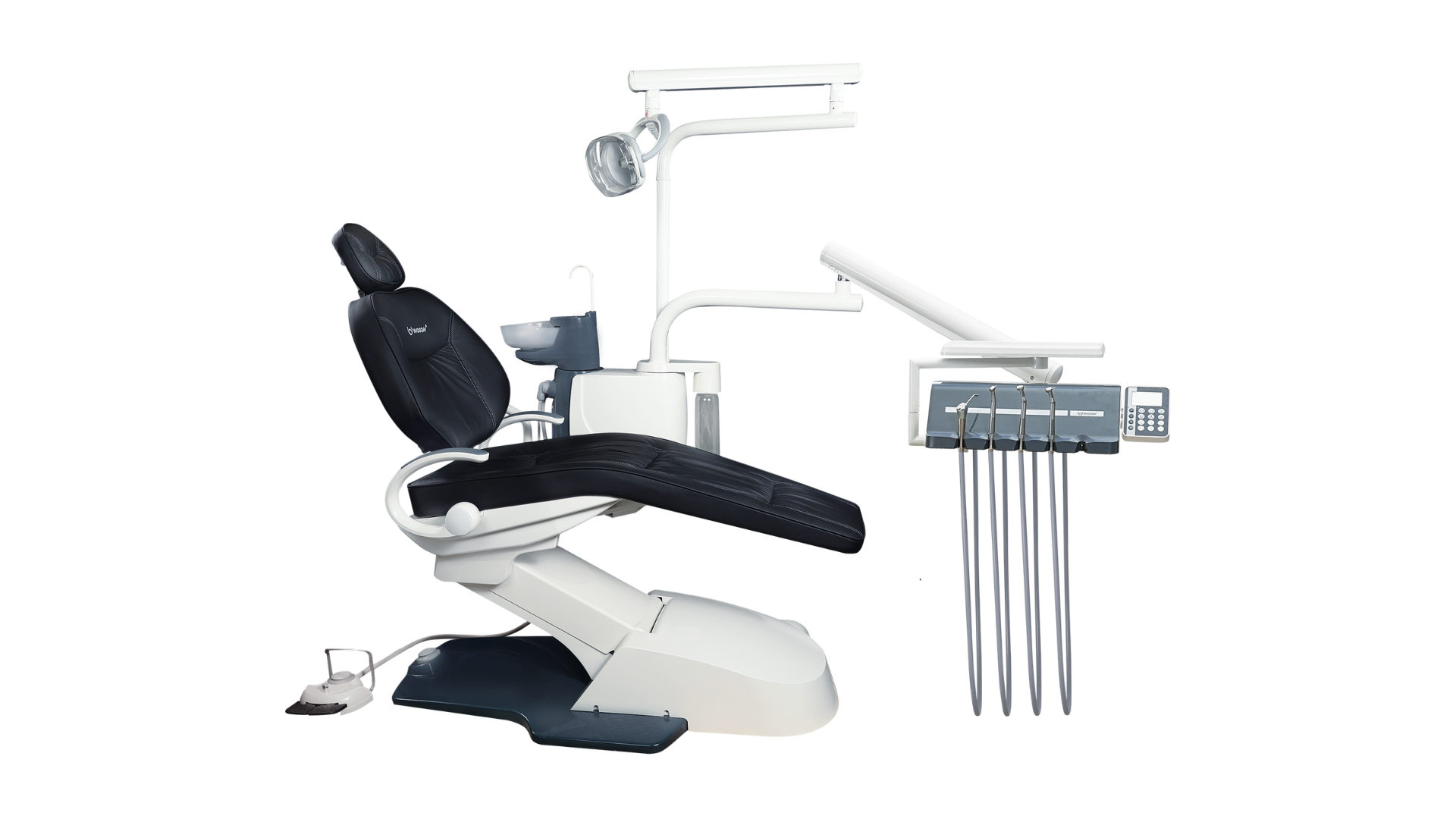 - Cadeira: base de aço, robusto sistema fuso de elevação associado a amortecedor com movimentos estáveis isentos de vibração. Sistema pantográfico de elevação com estrutura e eixos de aço com embuchamento de bronze nos cavaletes. Capacidade de elevação de até 200 kg. De série vem com filtro de água, ar, regulador de pressão e placa-mãe com proteção antichama. Estofamento de PVC de série, ou couro opcional, com espuma viscoelástico confortável. Apoio de cabeça multiarticulado com várias posições da cervical do paciente. Braço de acesso escamoteável.